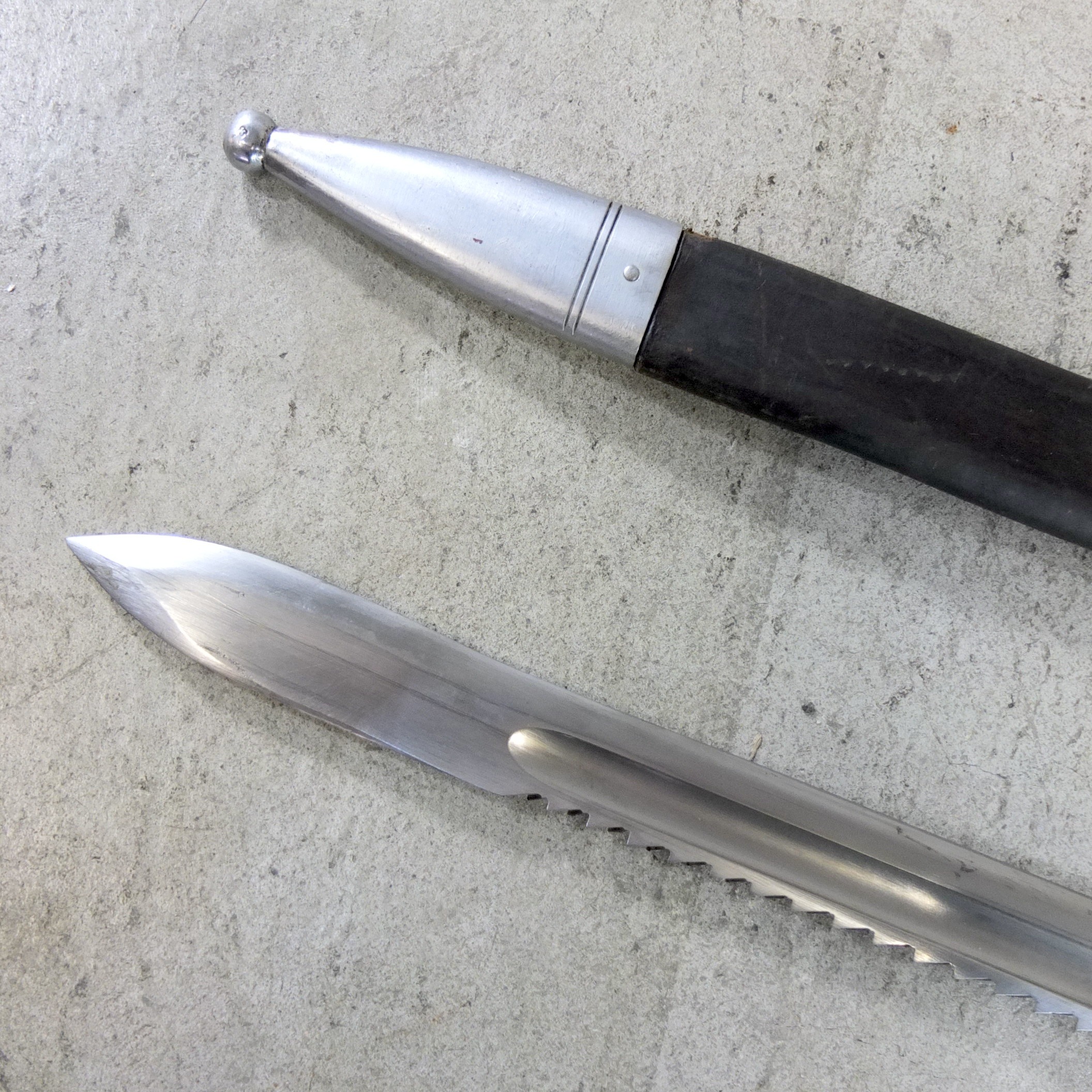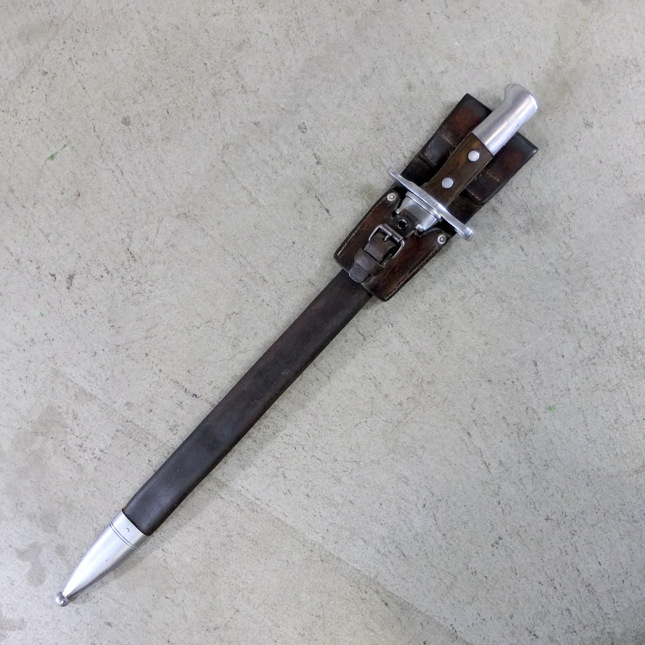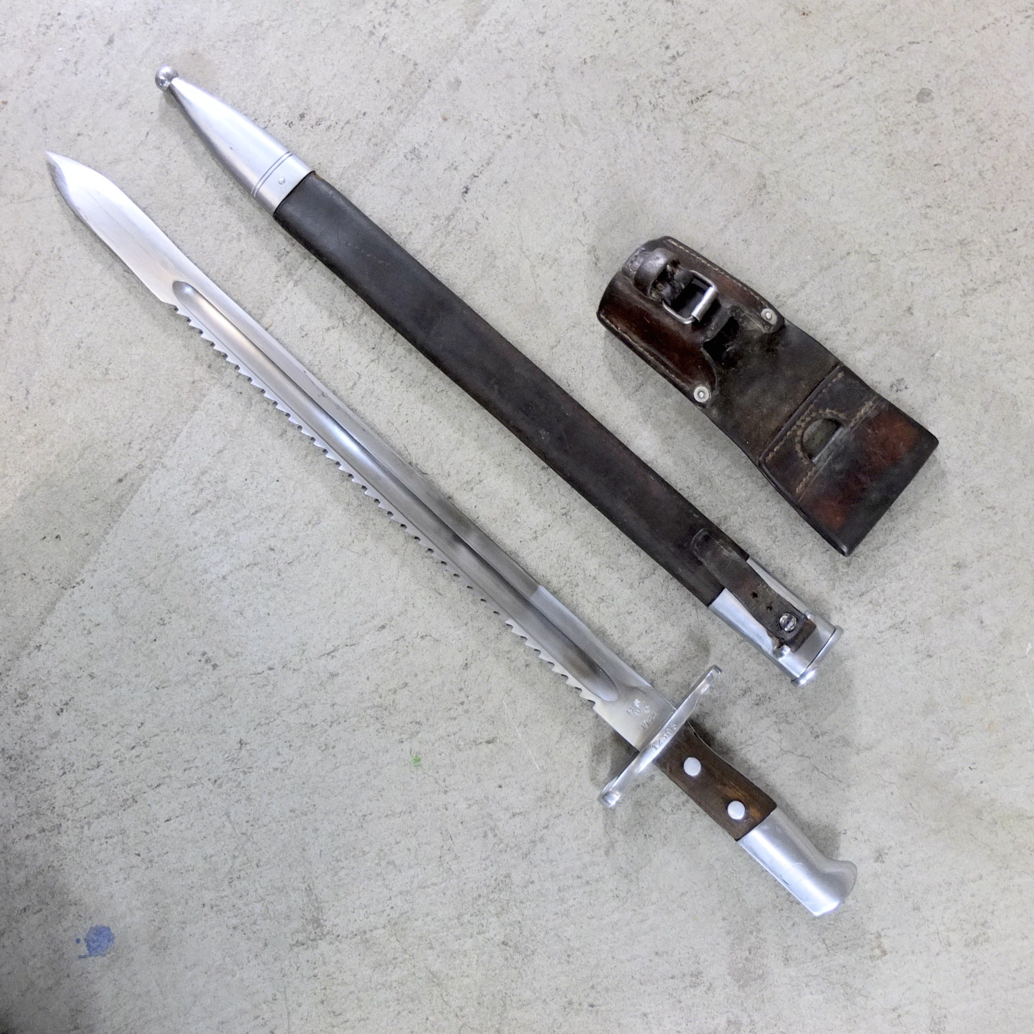 Swiss Army pioneer saw bayonet model 1914 with leather scabbard.