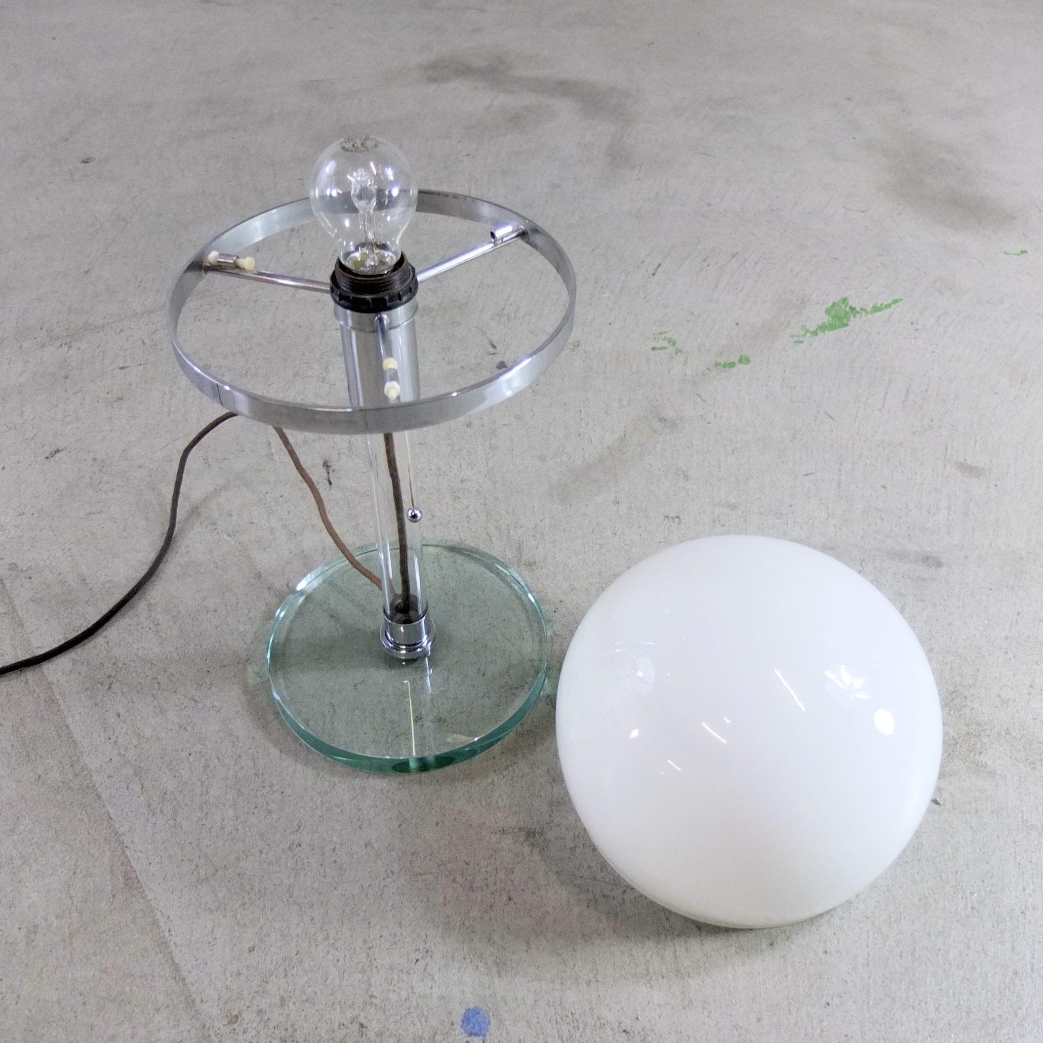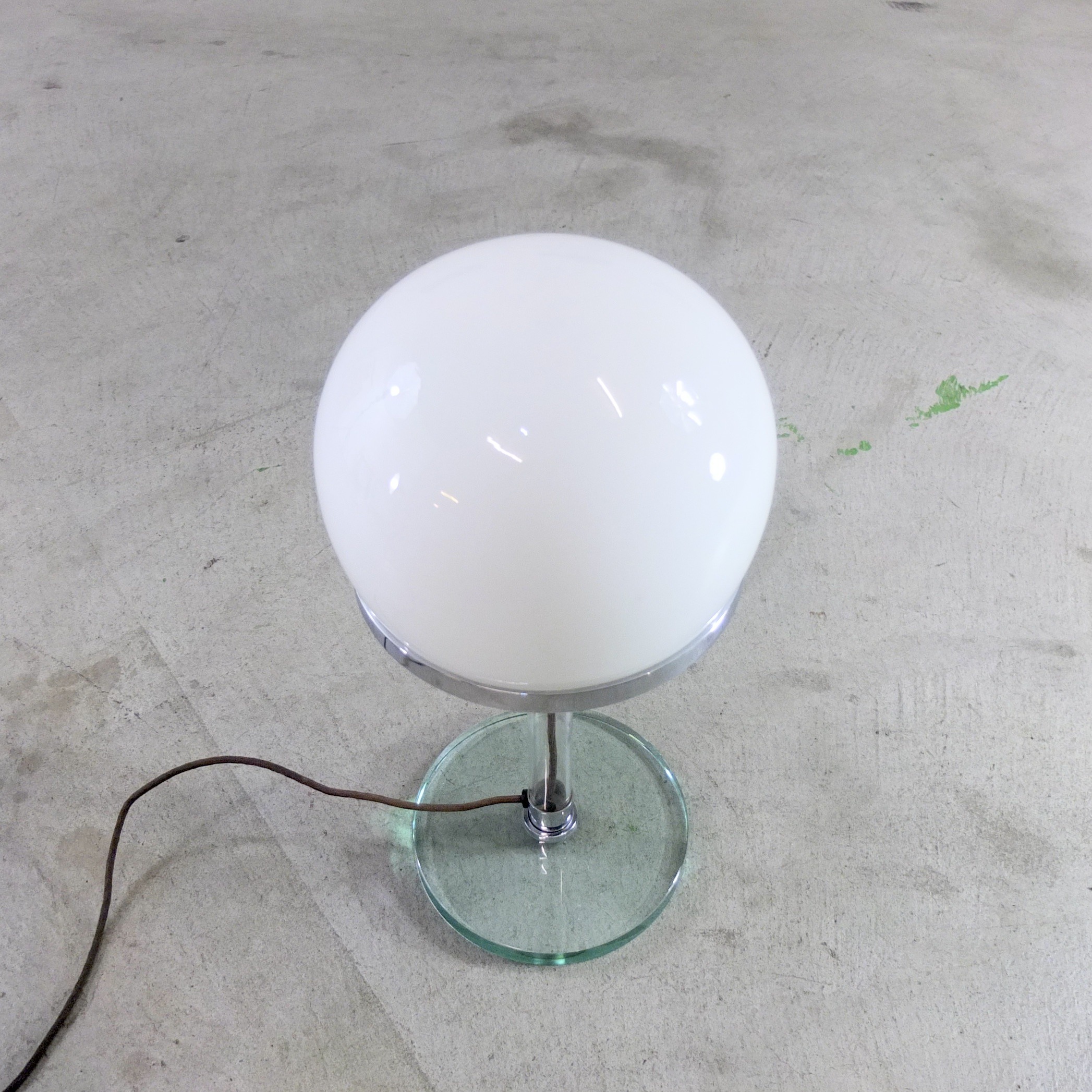 Elegante Tischleuchte mit Opalglas-Lampenschirm, Glasfuß und Plexiglasgehäuse.